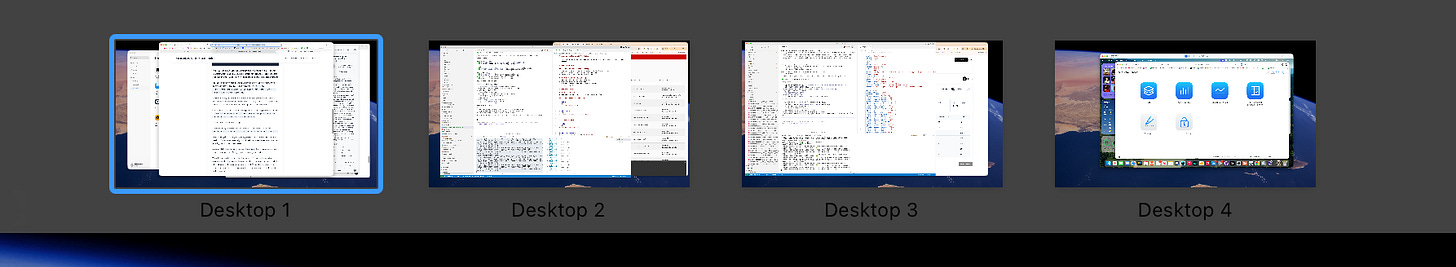 I will just swap between them as one of the instances is churning on something. And yea, sometimes I just want to stay working on one space for an hour or two.