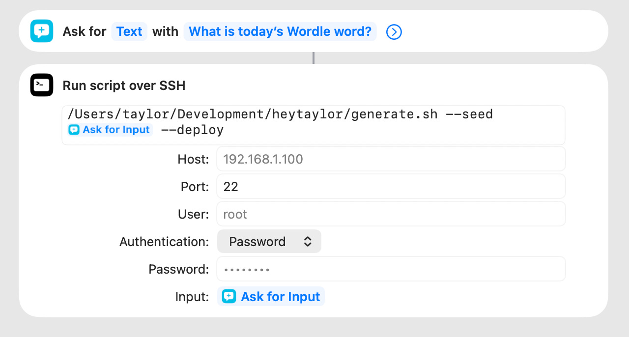 I run a shortcut on my phone to ssh into my home computer over Tailscale. It looks like this.