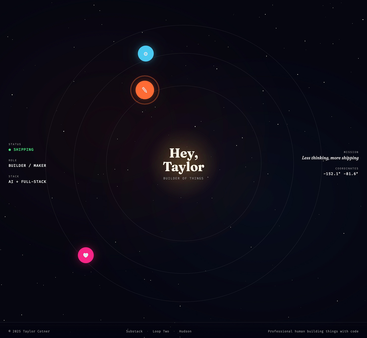 The Orbit: solar system space HUD with projects orbiting as planets, dark cosmic aesthetic, twinkling star field, nebula gradients, data readout panels, and counter-rotating labels.